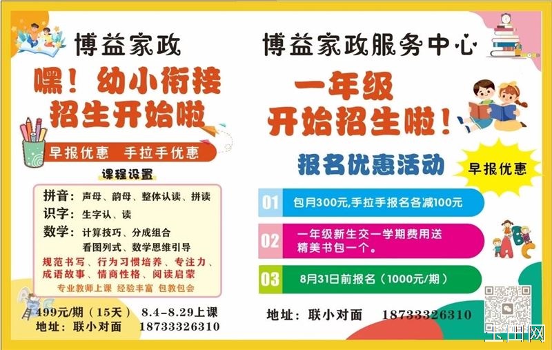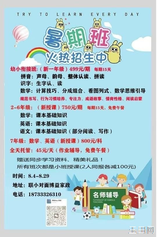暑假班报名了!资深专业老师授课。小班教学,名额有限,欲报从速!联系电话:18032519881。地址:联小对面